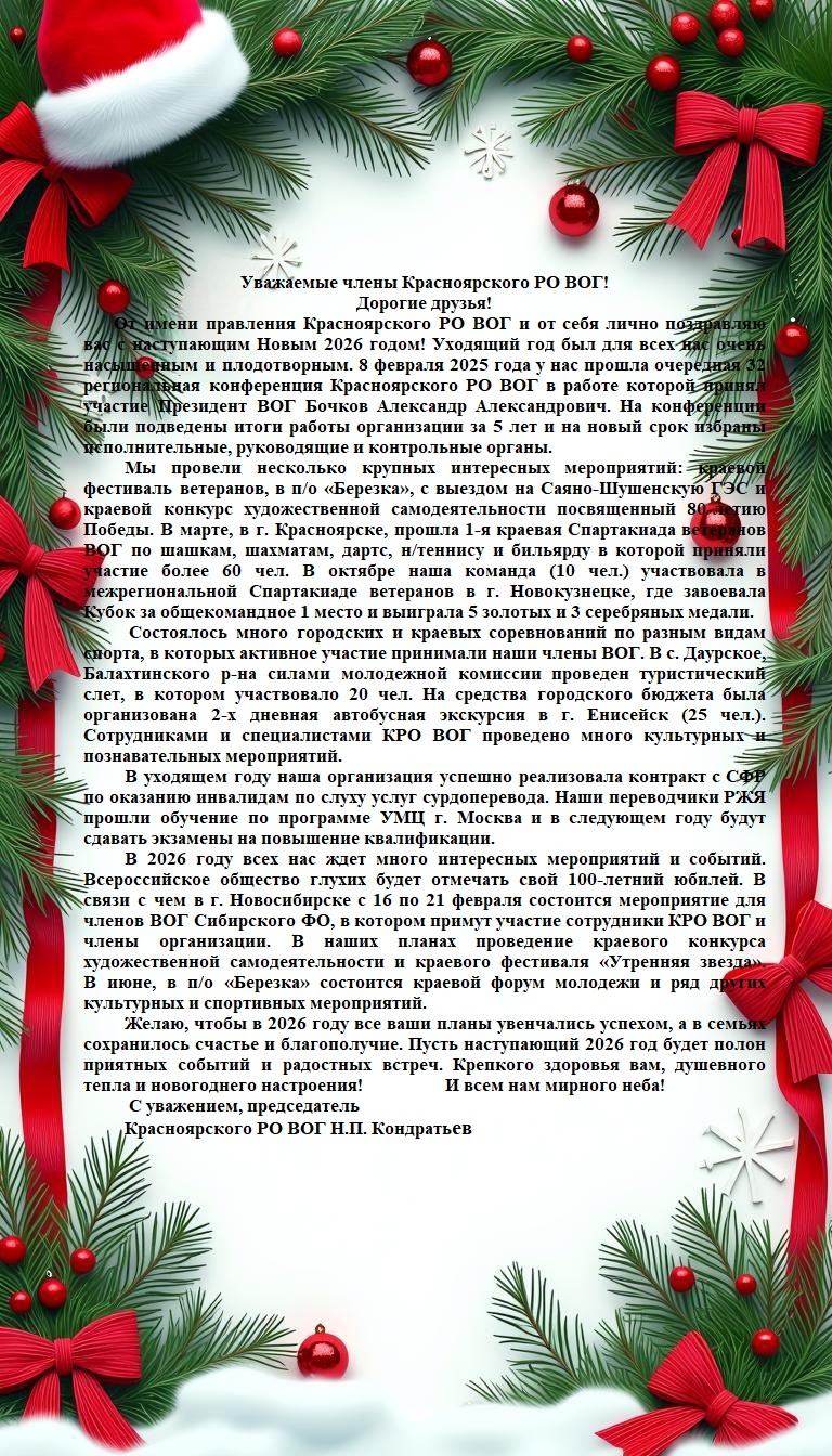 23 декабря председатель КРО ВОГ Кондратьев Н.П. и активист ВОГ Гусев А.Н. провели в Красноярской школе новогодний турнир по шашкам среди юношей и девушек. Победители и призеры соревнований получили грамоты и медали а все участники сладкие подарки.